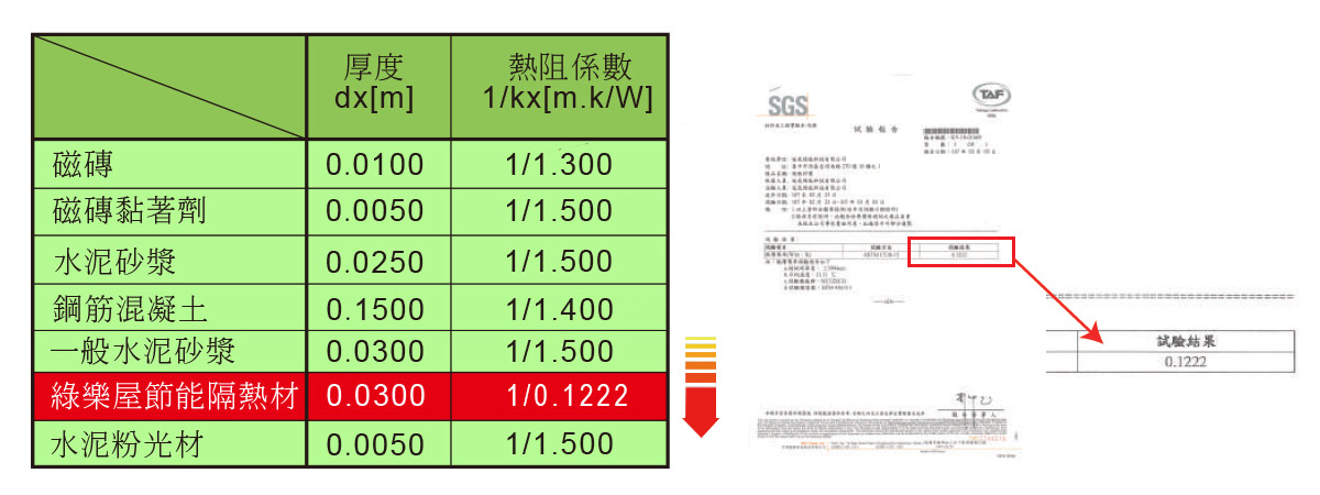 本產品經由台灣檢驗科技SGS.ASTM C518-15熱傳導率檢驗為0.1222(W/m.K),能有效降低溫度,可節能、抗寒,以符合國家綠建築節能外牆需求。