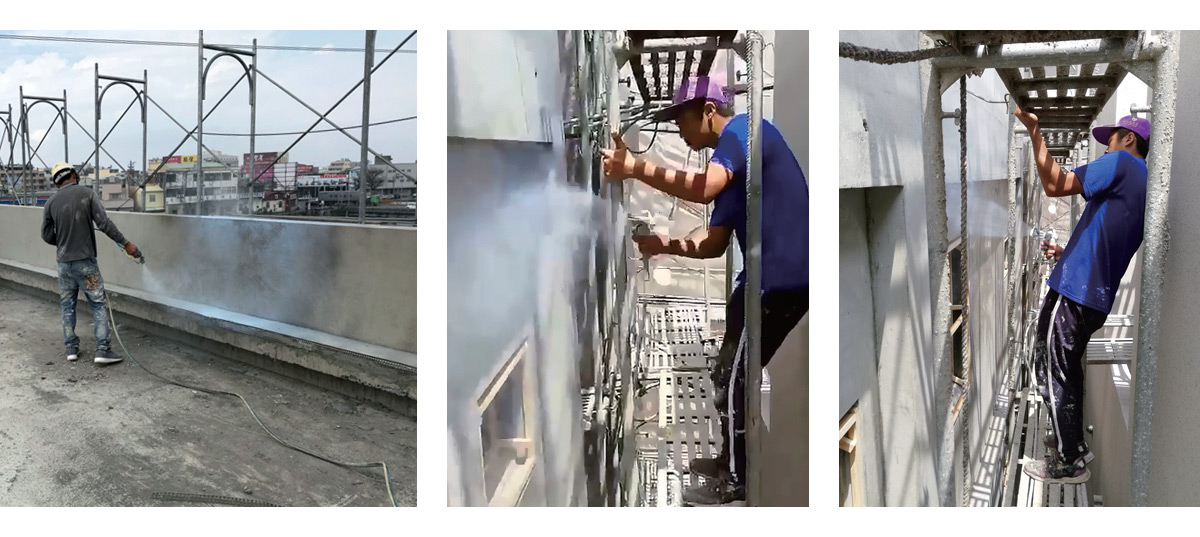 使用100%的水量做攪拌,且須用攪拌器充分攪拌均勻;再以刷子或滾輪將塗佈或噴塗方式於施工面上。